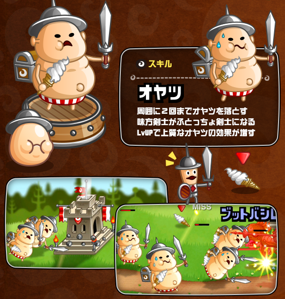 自軍と敵軍が左右に陣取り、お互いの城をめがけてユニットを進軍させ、相手とぶつかったキャラクター同士が勝手に戦います。